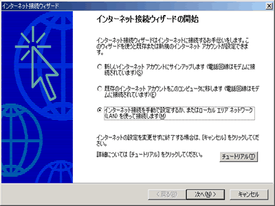 「インターネット接続を手動で設定するか、またはローカルエリアネットワーク(LAN)を使って接続します」にチェックを入れ、[次へ]ボタンをクリックします。