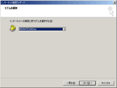 「モデム選択」画面が表示されますので、お使いのターミナルアダプタを選択し、[次へ]ボタンをクリックします。