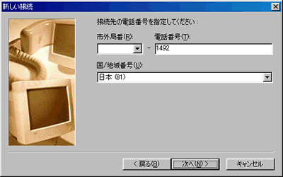 「接続先の電話番号」を下記のとおり入力し、[次へ]ボタンをクリックします。
