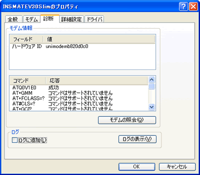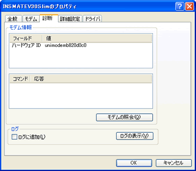 [モデムの照会]ボタンをクリックします。「モデムを使って通信しています。この処理には数秒かかります。」のメッセージの後、[コマンド] [応答]に文字列が表示されればパソコンとモデム間の通信が正常に行える状態になっています。