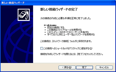 「新しい接続ウィザードの完了」画面が表示されますので、 [完了]ボタンをクリックします。