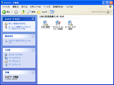 | 「ネットワーク接続」画面の左部にある「ネットワークタスク」から「新しい接続を作成する」をクリックします。