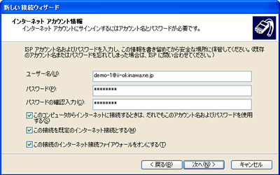 「インターネット アカウント情報」画面より下記のとおり入力し、[次へ]ボタンをクリックします。