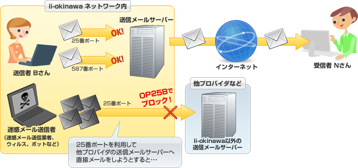 メールの送信には通常「25番ポート」という経路が使われますが、25番ポートブロック(OP25B)では、プロバイダの提供するメールサーバ以外への「25番ポート」の利用を制限します。 ![]() 25番ポートブロック (OP25B)の実施時期について