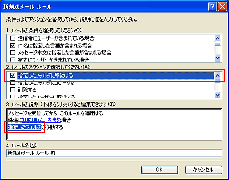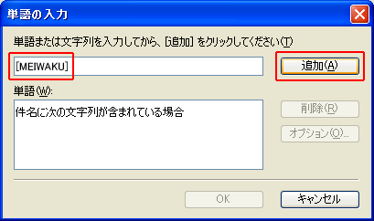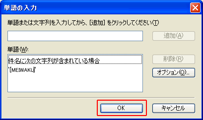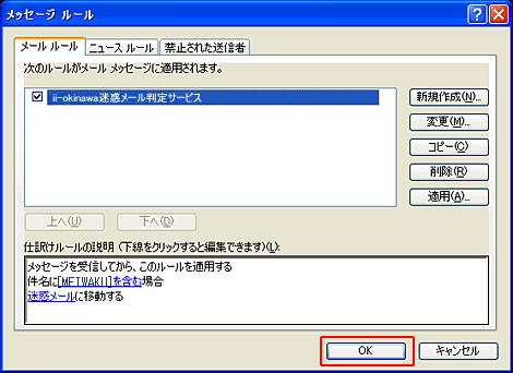 本設定例は迷惑メール判定サービスを「有効」と設定した場合の設定例です。 1.Outlook Expressの起動OutlookExpress(Version6.0) を起動します。 2.メッセージルールメニューバーの「ツール」より「メッセージルール」を選択し、「メール」をクリックします。 3.ルールの条件1.ルールの条件選択より、「件名に指定した言葉が含まれる場合」をチェックし、3.ルールの説明より「指定した言葉が含まれる」(ハイパーリンク)をクリックします。 4.単語の入力入力欄に 半角大文字で [MEIWAKU] と正しく入力し、「追加」ボタンをクリックします。 5.単語の入力下の単語リストに [MEIWAKU] が追加されたことを確認し 「OK」ボタンをクリックします。 6.ルールのアクション2.ルールのアクション選択より、「指定したフォルダに移動する」をチェックし、3.ルールの説明より「指定したフォルダ」(ハイパーリンク)をクリックします。 7.移動先のフォルダ「新規フォルダ」ボタンをクリックして、任意のフォルダを作ります。 8.移動先フォルダの作成任意のフォルダ名を入力し、「OK」ボタンをクリックします。 9.移動先フォルダの選択作成したフォルダを選択して、「OK」ボタンをクリックします。 10.ルール名4.ルール名に任意の名前を入力し、「OK」ボタンをクリックします。 11.設定完了メールルールに設定したルール名がチェックされていることを確認し、「OK」ボタンをクリックします。 |