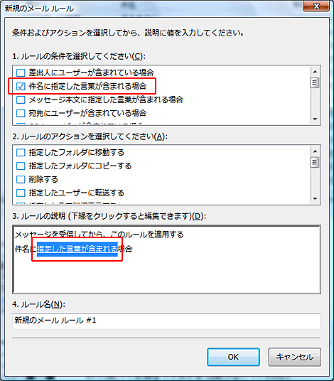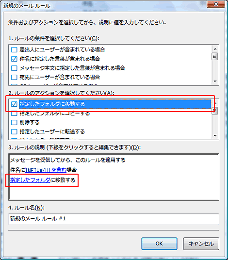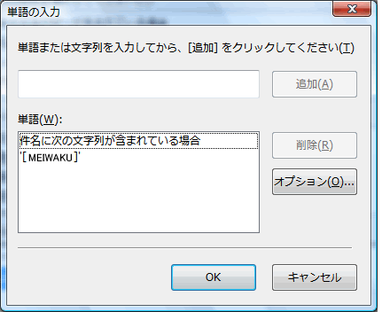 本設定例は迷惑メール判定サービスを「有効」と設定した場合の設定例です。 1.Windowsメールの起動Windowsメール(Version6.0) を起動します。 2.メッセージルールメニューバーの「ツール」より「メッセージルール」を選択し、「メール」をクリックします。 3.ルールの条件1.ルールの条件選択より、「件名に指定した言葉が含まれる場合」をチェックし、3.ルールの説明より「指定した言葉が含まれる」(ハイパーリンク)をクリックします。 4.単語の入力入力欄に 半角大文字で [MEIWAKU] と正しく入力し、「追加」ボタンをクリックします。 5.単語の入力下の単語リストに [MEIWAKU] が追加されたことを確認し 「OK」ボタンをクリックします。 6. ルールのアクション2.ルールのアクション選択より、「指定したフォルダに移動する」をチェックし、3.ルールの説明より「指定したフォルダ」(ハイパーリンク)をクリックします。 7.移動先のフォルダ(1)「新規フォルダ」ボタンをクリックして、任意のフォルダを作ります。 8.移動先のフォルダ(2)既に「迷惑メール」等といったフォルダがある場合は、フォルダを選択して「OK」ボタンをクリックします。 9.ルール名4.ルール名に任意の名前を入力し、「OK」ボタンをクリックします。 10.設定完了メールルールに設定したルール名がチェックされていることを確認し、「OK」ボタンをクリックします。 |