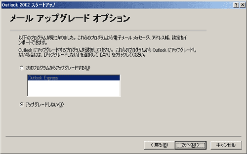 | すでにお使いのメールソフトウェアがある場合は、「メール アップグレード オプション」の画面が表示されます。「次へ(N) >」ボタンをクリックします。