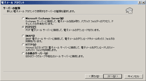「サーバーの種類」の画面が表示されます。POP3(P)を選択し、、「次へ(N) >」ボタンをクリックします。