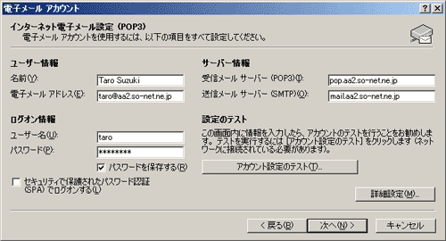 表示された「インターネット電子メール設定 (POP3)」の画面を、以下のように設定します。