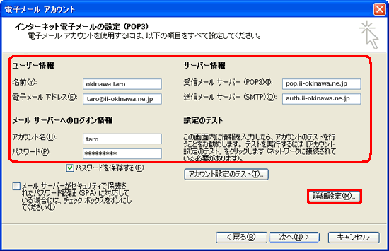 お客様のメールアドレスを入力します。 (例)taro@ii-okinawa.ne.jp |