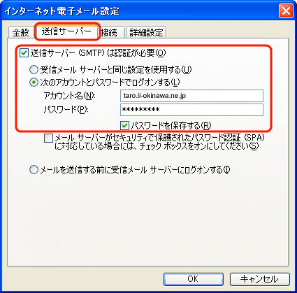 【送信サーバー(SMTP)は認証が必要】にチェックを入れます。 |