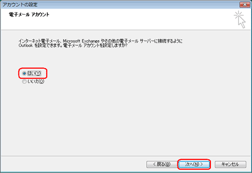 「電子メールアカウント」画面が表示されます。【はい】を選択し、【次へ】をクリックします。