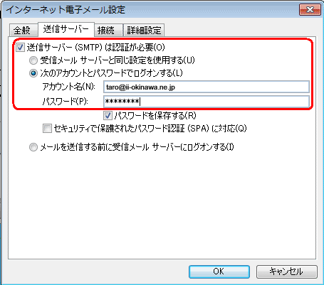 お客様のメールアドレスを入力します。 (例) example@ii-okinawa.ne.jp |