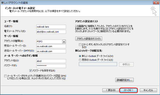 | 「インターネット電子メール設定」画面に戻ったら、【次へ】をクリックします。
