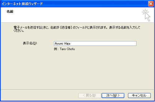 表示された【インターネット接続ウィザード】の【名前】の画面にて、以下のように 設定します。