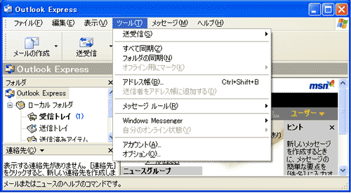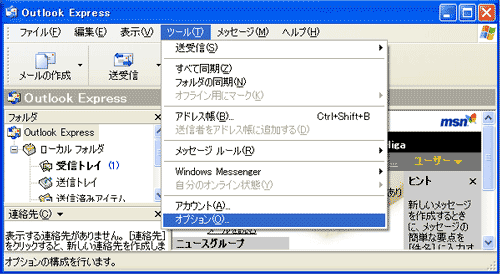 | 表示された【Outlook Express】の画面にて、メニューバーの【ツール(T)】から【オプション(O)...】を選択します。