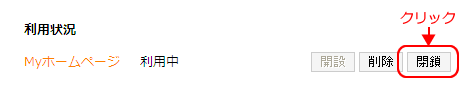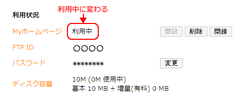 (4) Myホームページ領域の開設 「Myホームページ」設定画面が表示されますので、「開設」ボタンをクリックし、Myホームページ領域を開設してください。 次にお客様のアカウント(FTP ID)を選択し、ホームページ開設をクリックしてください。 利用状況が「利用中」に変わり、Myホームページ領域が開設されます。 (5) ログアウト 画面左側のメニューの「ログアウト」ボタンをクリックすると、ii-okinawaコントロールパネルからログアウトします。 以上でMyホームページ領域の開設は完了です。 コンテンツファイルの一括削除Webサーバ上のすべてのコンテンツファイルを一括削除するには、コントロールパネル「Myホームページ」より、「削除」をクリックします。 Myホームページ領域の閉鎖Myホームページ領域を閉鎖するには、コントロールパネル「Myホームページ」より、「削除」をクリックします。 ホームページの公開についてコンテンツファイルのアップロード ファイル転送ソフト(FTPソフト)等を使用し、お客様がご用意したコンテンツファイルをWebサーバへアップロードを行ってください。 アクセス制限方法 ベーシック認証によるアクセス制御をご利用の場合、.htaccessファイル の AuthUserFile の絶対パスには次のとおり記述していただきますようお願い致します。