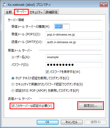 「サーバー」タブをクリックし、【このサーバーは認証が必要】にチェックが入っていることを確認します。