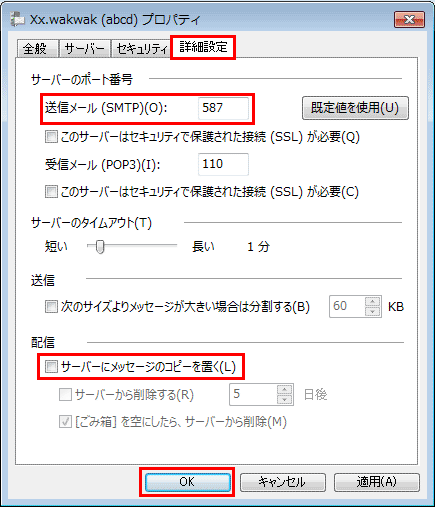 「Windows Live メール」画面の各項目を以下のように設定します。