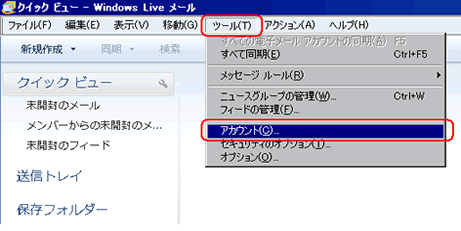 Windows Liveメール を起動し、メニューバー 『ツール』 から 『アカウント』を選択します。