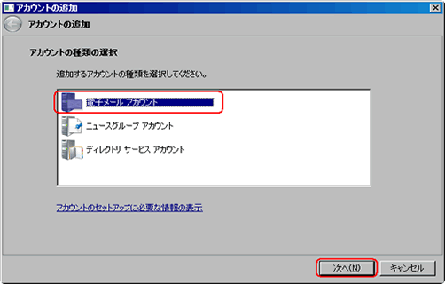 電子メールアカウントを選択し、【次へ】ボタンをクリックします。