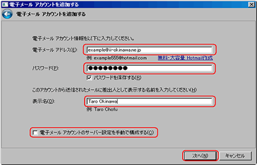 「電子メールアカウントのサーバー設定を手動で構成する」 にチェックする。 |