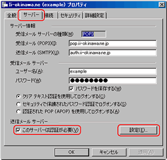 プロパティ画面より[サーバー]タブをクリックし、『このサーバーは認証が必要』にチェックを入れたあと、